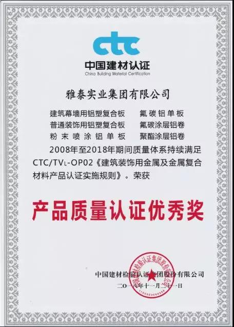會(huì)上,雅泰產(chǎn)品憑借2008年至今2018年期間質(zhì)量體系持續(xù)滿足CTC/TVL-OP02《建筑裝飾用金屬及金屬復(fù)合材料產(chǎn)品認(rèn)證實(shí)施規(guī)則》,榮獲2018年度CTC產(chǎn)品質(zhì)量認(rèn)證優(yōu)秀獎(jiǎng)。YARET牌鋁塑復(fù)合板,2015年至2018年期間經(jīng)中國建材檢驗(yàn)認(rèn)證集團(tuán)股份有限公司抽樣全項(xiàng)檢測,產(chǎn)品質(zhì)量符合中華人民共和國國家標(biāo)準(zhǔn)(GB/T 17748-2016/2008、GB/T22412-2016),被授予2018年度產(chǎn)品合格證。