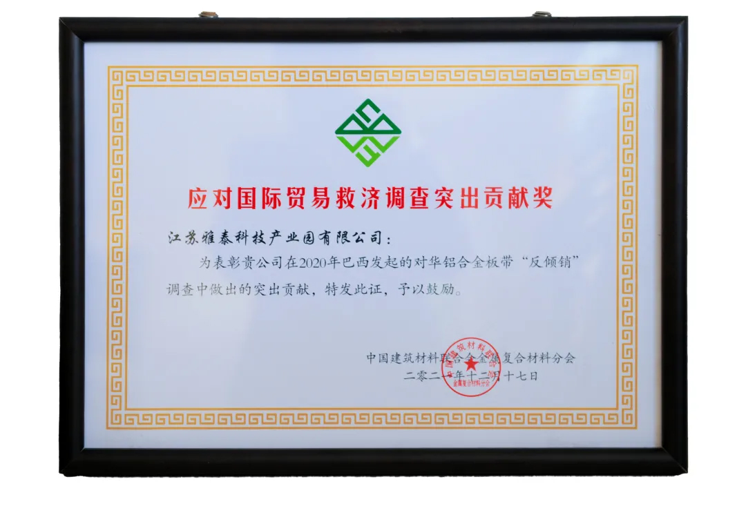 2021年,受各種不可抗力因素影響,國際市場貿(mào)易摩擦不斷,雅泰外貿(mào)形勢略為嚴(yán)峻,但雅泰通過強(qiáng)大的國家背書,尋求各方支持幫助、積極應(yīng)對(duì),成功打贏反傾銷一案,大會(huì)特別頒發(fā) “應(yīng)對(duì)國際貿(mào)易救濟(jì)調(diào)查突出貢獻(xiàn)獎(jiǎng)” 。